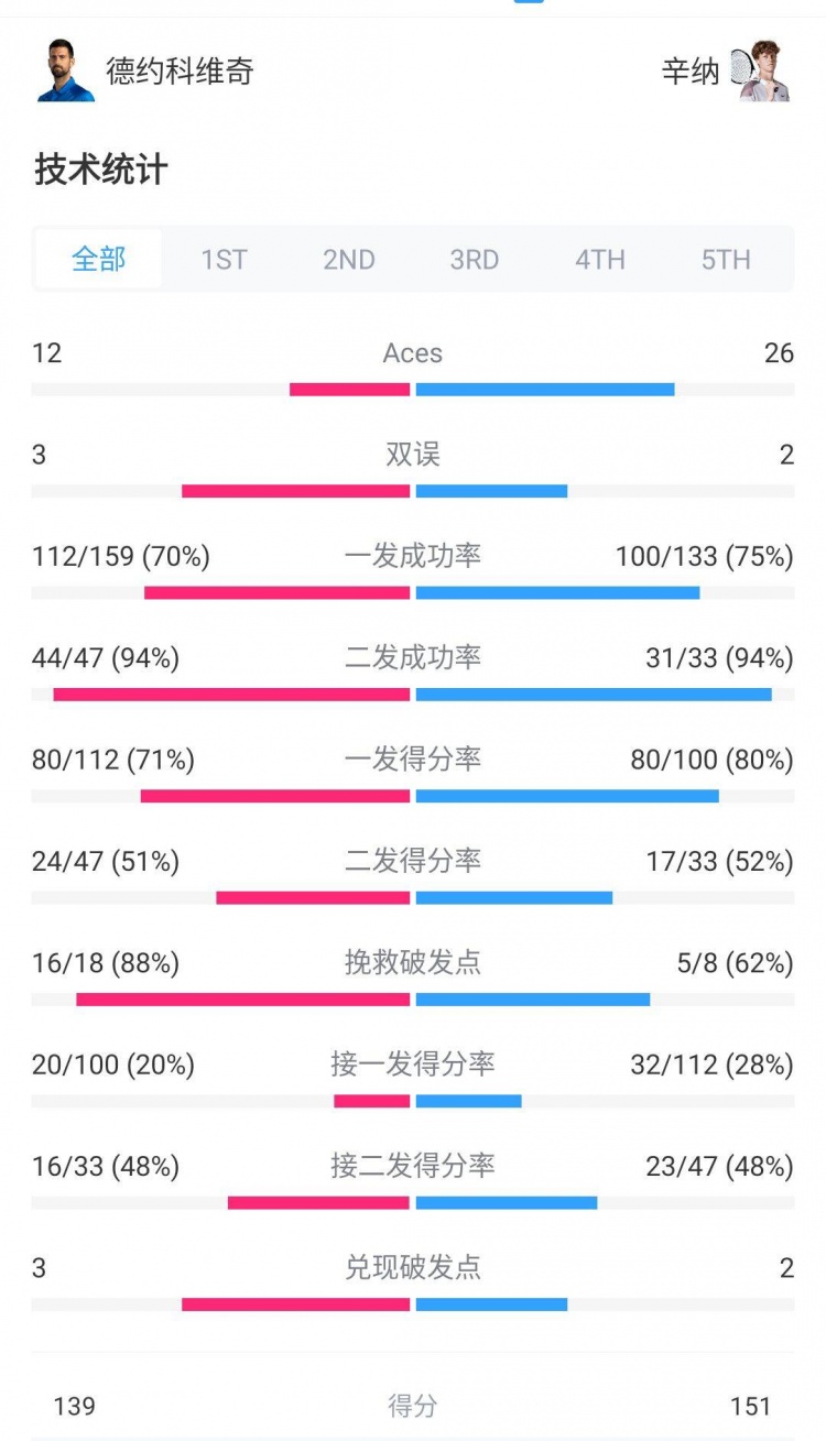 从数据中可以看到,德约科维奇的发球、总分、制胜分和接发等关键数据均处于下风,但在控制失误、破发点的关键球处理上遥遥领先于辛纳。