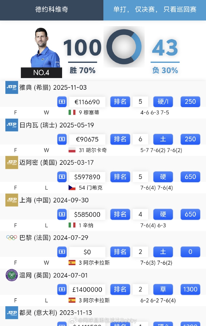 据数据统计,德约总计单打巡回赛共143次进决赛,取得100胜43负的战绩。胜率高达70%。