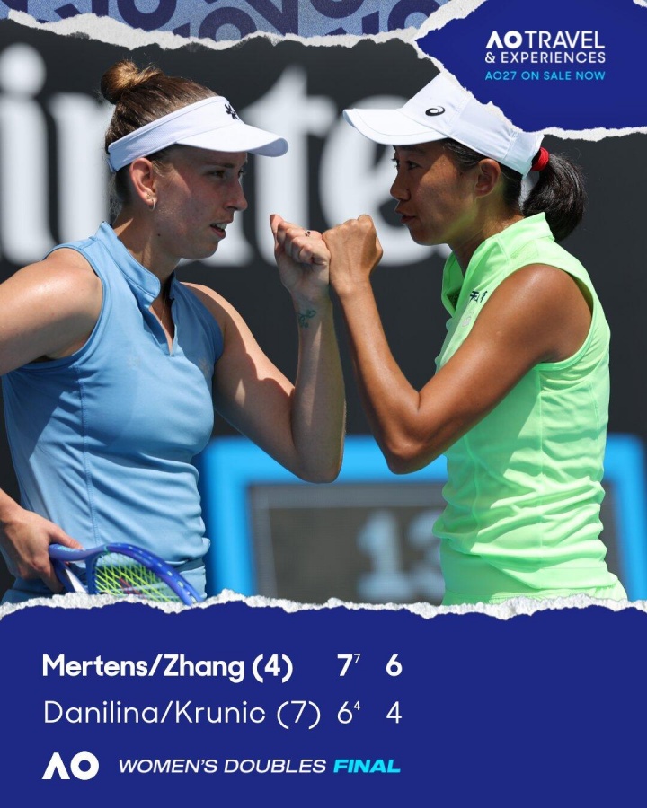 01月31日消息 2026年澳网公开赛迎来女双决赛争夺,中国金花张帅搭档比利时选手梅尔滕斯,以7-6(4)、6-4击败对手,成功摘得本届澳网女双项目冠军。