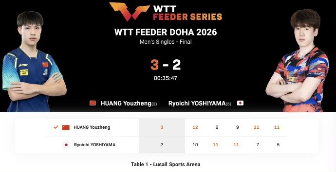 2月1日消息 WTT支线赛多哈站男单决赛,黄友政3-2战胜吉山僚一,夺得冠军!