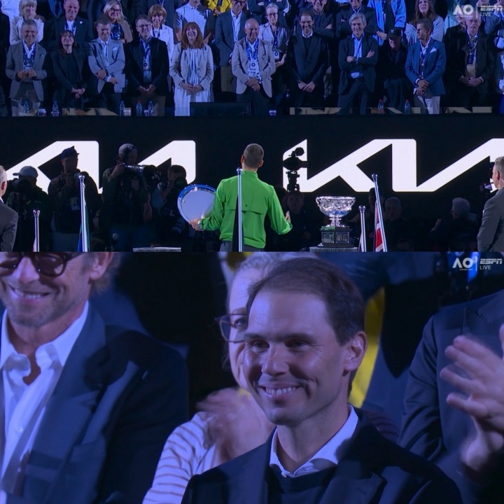 德约科维奇:“看到拉法(纳达尔)坐在场观众席而非场边,这种感觉很奇妙。能和你同场竞技,你能来观看这场决赛,是我的荣幸,感谢你的到来。但这里汇聚了太多西班牙名宿,今天感觉就像是二打一,这实在是不公平!”