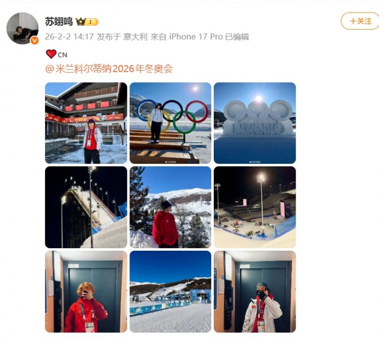 2月2日消息 中国滑雪运动员苏翊鸣更新社媒,晒出了在米兰冬奥村的自拍。