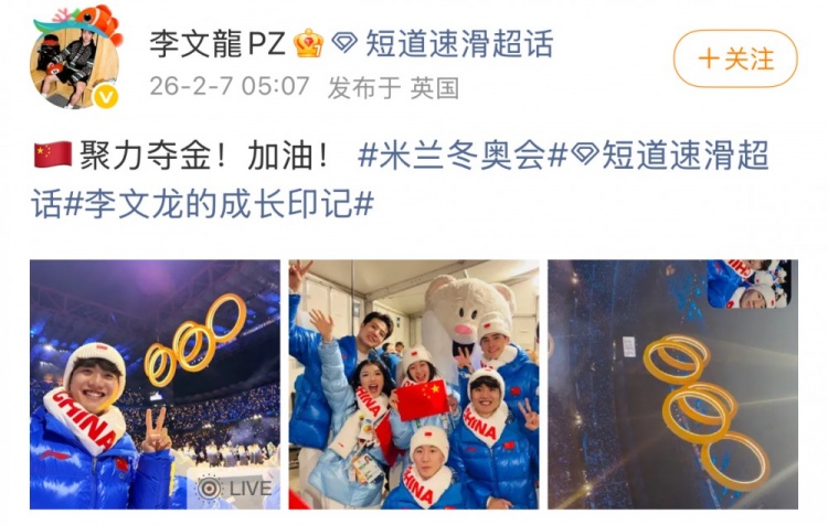 2月7日消息 2026米兰冬奥会正式拉开帷幕,中国男子短道速滑运动员李文龙更新社媒,晒出自己亮相开幕式的照片。