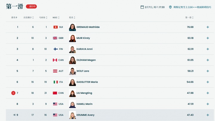 02月07日消息 米兰冬奥会自由式滑雪女子坡面障碍技巧预赛,刘梦婷第18顺位出战顺利完成第一滑,雪道上展现出稳扎稳打的竞技状态,获得47.98分。