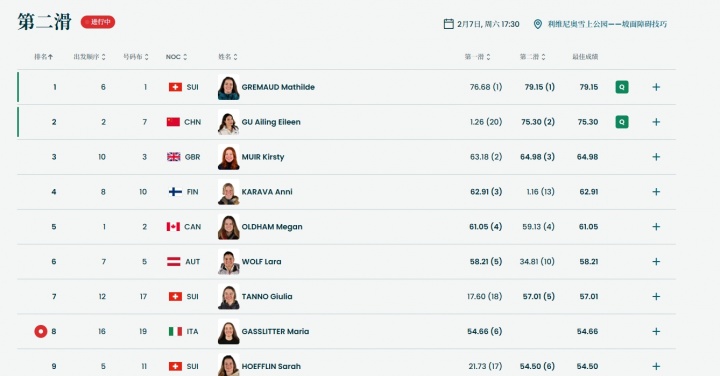晋级规则:预赛共26名选手参赛,所有选手进行两轮滑行,取单轮最佳成绩排名,总排名前12名晋级决赛。决赛将于北京时间2月9日19:30进行。
