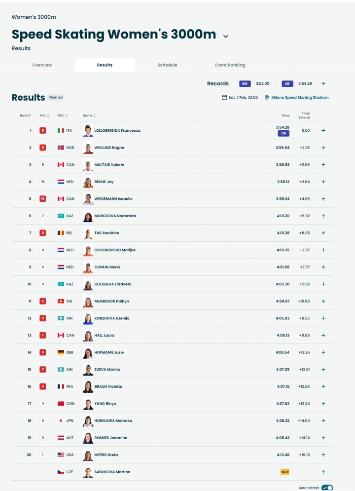 速度滑冰女子3000米决赛:杨滨瑜第17,洛洛布里吉达夺东道主首金