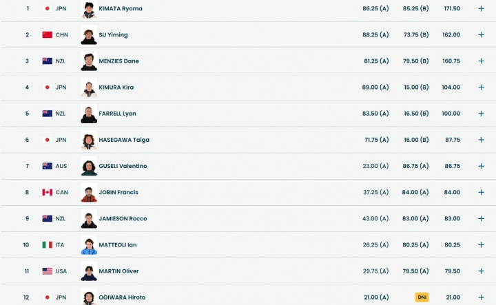 苏翊鸣第二跳1980落地触雪,获得73.75分,前两跳共162.00分,暂排第二。