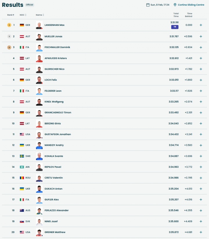 男子单人雪橇:马克斯·朗根汉夺金,鲍振宇追平中国男子最好成绩