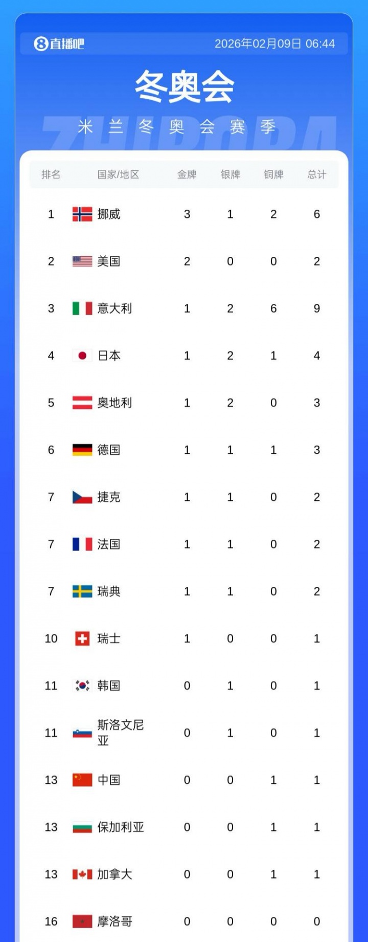 02月09日消息 米兰冬奥会8号比赛结束,截至目前已产生13枚金牌。