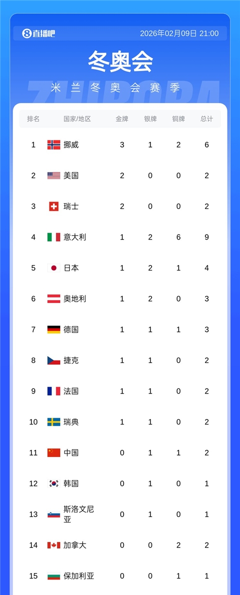 02月09日消息 米兰冬奥会自由式滑雪女子坡面障碍技巧决赛,中国选手谷爱凌连续两届夺得银牌,中国队以1银1铜,升至奖牌榜第11,挪威队3金1银2铜排在榜首。