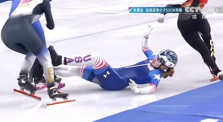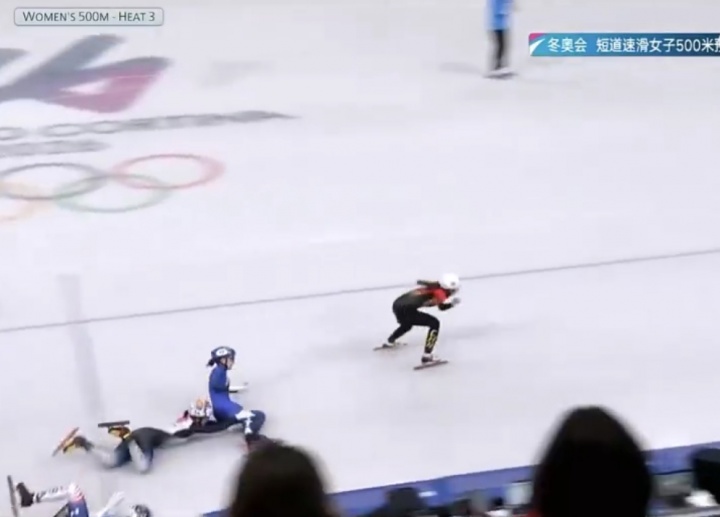 美国选手带倒另外两人,王欣然晋级短道速滑女子500米1/4决赛