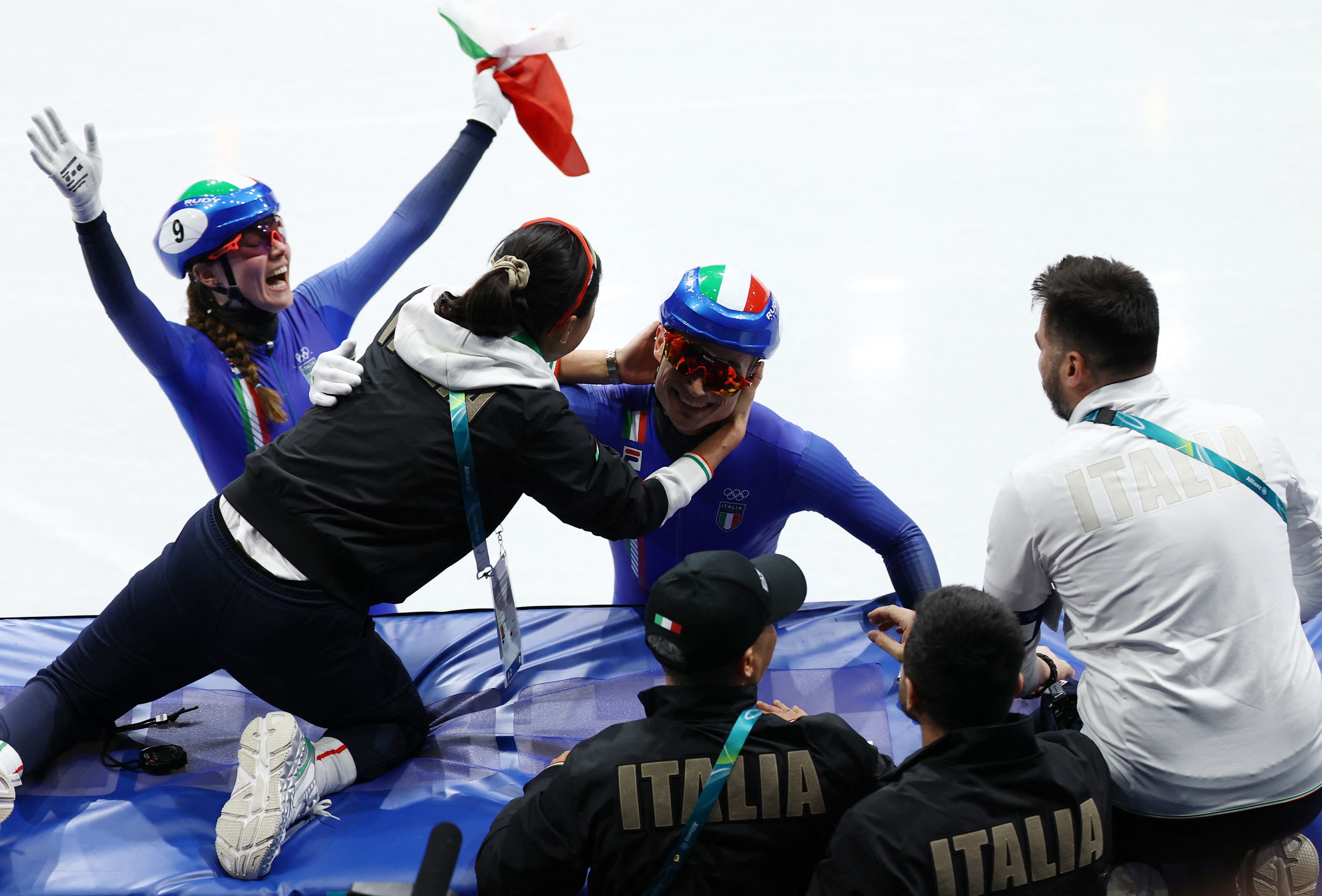 02月10日消息 东道主意大利夺得短道速滑混团接力冠军,这是本届冬奥会短道速滑首枚金牌。夺冠之后,意大利主教练非常激动,在场边与队员拥抱庆祝,值得一提的是,执掌这支队伍帅印的是从长春走出去的中国教练员齐梦瑶。