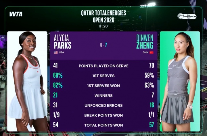 02月11日消息 多哈站第二轮对决,郑钦文挽救两个盘点,通过抢七以7-6(4)先赢一盘,大比分1-0领先帕克斯!