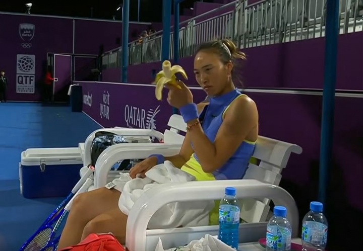 比赛期间,郑钦文在场边补给时,发现香蕉上有蚂蚁,她弹掉蚂蚁后端详再三,接着把香蕉吃了。