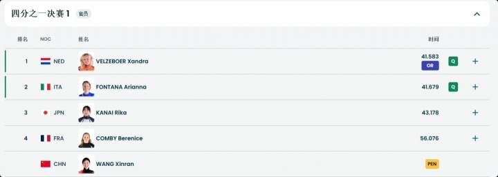 02月13日消息 米兰冬奥会短道速滑女子500米1/4决赛,王欣然与法国选手碰撞,被判犯规无缘下一轮。