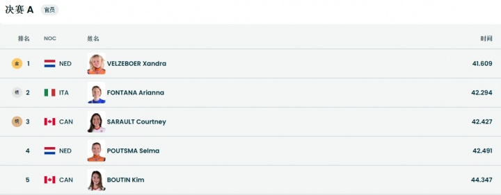 02月13日消息 冬奥会短道速滑女子500米决赛,荷兰选手桑德拉·贝尔塞伯41秒609夺得金牌,意大利老将阿里安娜·丰塔纳获得银牌,加拿大选手考特妮·萨罗获得铜牌。