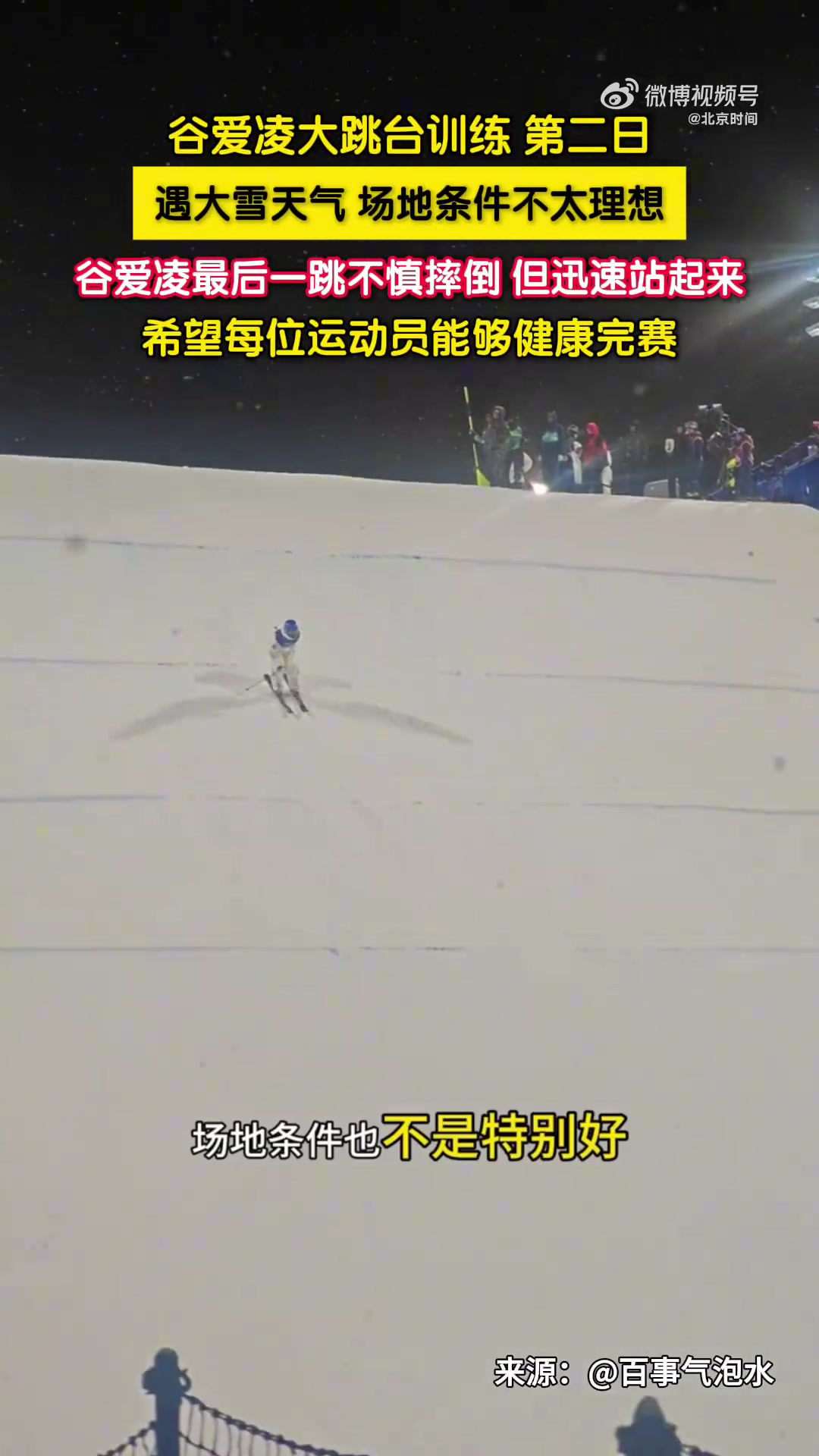 大跳台训练第二日,谷爱凌最后一跳时不慎摔倒
