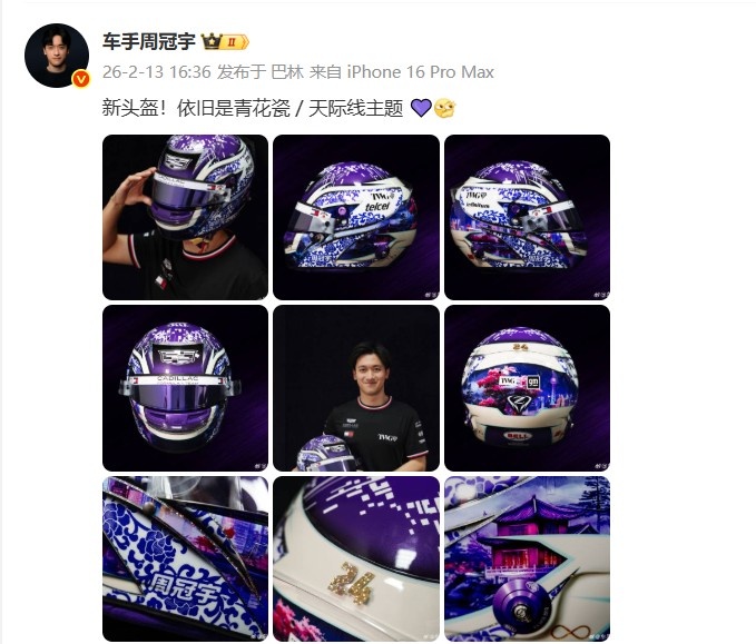 加盟凯迪拉克车队!周冠宇晒紫色新头盔:依旧是青花瓷天际线主题