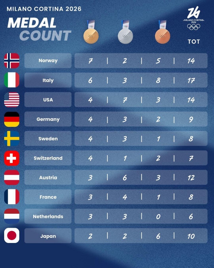 据米兰冬奥会官网统计,本届赛事116个小项已产生44枚金牌,还剩72枚金牌。