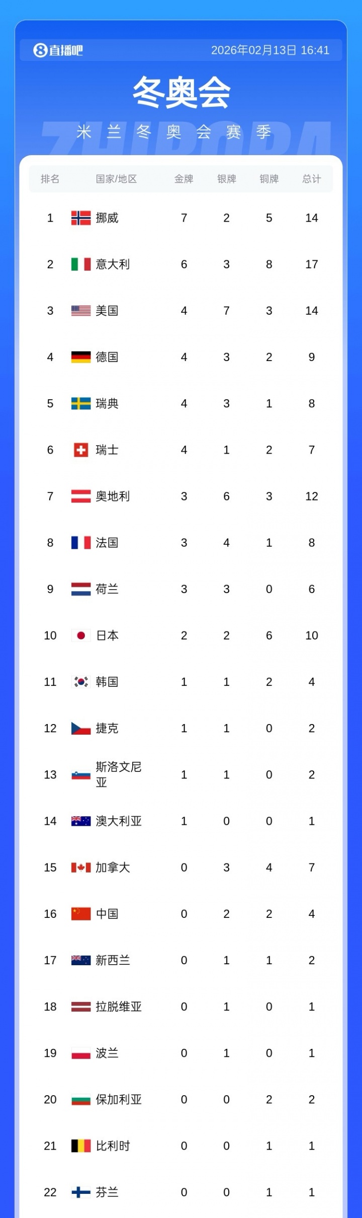 02月13日消息 米兰冬奥会第6个比赛日战罢,孙龙在短道速滑男子1000米摘银,为中国队拿到本届冬奥会第4枚奖牌。奖牌榜上,中国队2银2铜排名第16。