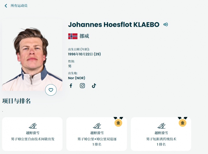传奇!挪威选手克莱博越野滑雪3项夺3金,冬奥8次夺金平历史记录