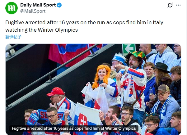 2月14日消息 据《邮报》报道,斯洛伐克一男子潜逃16年后,回意大利观看冬奥会被捕。