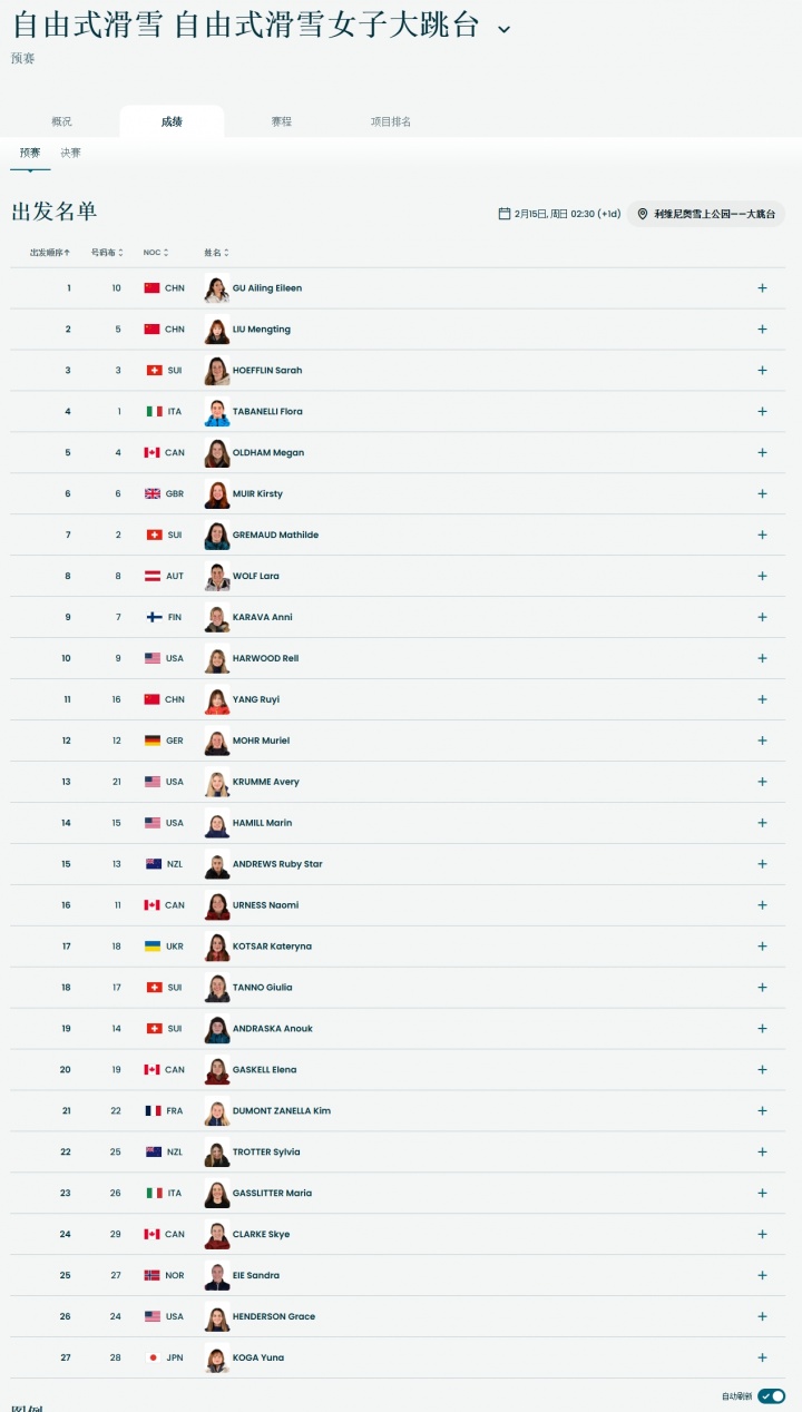 来源:黑白体育作者:嘴中余温2026-02-15 01:45:0002月15日消息 米兰冬奥会自由式滑雪女子大跳台预赛,米兰冬奥官网显示韩林杉已不在大跳台预赛名单上,另外三位中国选手谷爱凌、刘梦婷、杨如意将于2:30冲击决赛席位。