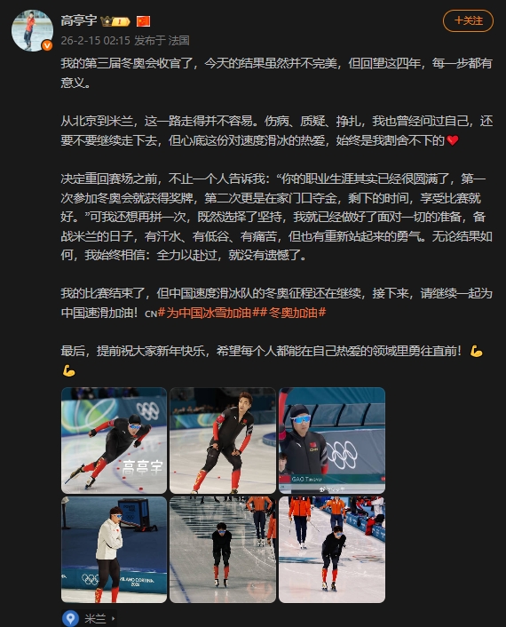 02月15日消息 米兰冬奥会速度滑冰男子500米决赛,卫冕冠军高亭宇以34秒47完赛最终排名第七。赛后他更新个人社交媒体,