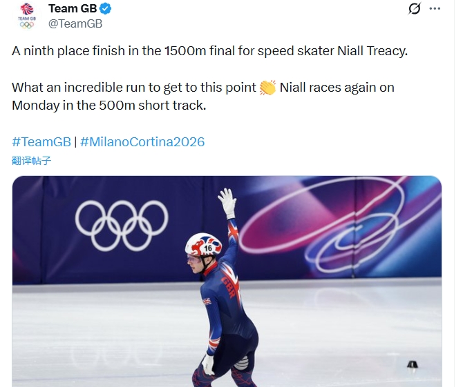 英国奥运队的官推赛后写道:“速度滑冰选手尼尔·特雷西在1500米决赛中获得第九名。能够走到这一步,已经是相当了不起的成就了👏 尼尔将在周一的500米短道比赛中再次亮相。”