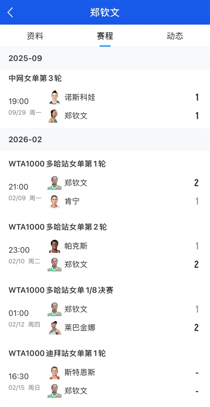 上一站郑钦文参加的是多哈站比赛,她在16强比赛中1-2不敌新科澳网冠军莱巴金娜,遗憾止步。