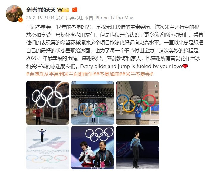 金博洋在社媒中写道:“三届冬奥会,12年的冬奥时光,是我无比珍惜的宝贵经历。这次米兰之行真的很放松和享受,虽然怀念老朋友们,但是也很开心认识了更多优秀的运动员们,看着他们的表现真的希望花样滑冰这个项目能够更好迈向更高水平。一直以来总是想把自己的最好的状态呈现给冰面,也为了每一个细节付出全力,这次美妙的旅程是2026开年最幸福的事情。感谢领导,感谢教练和家人,也感谢所有喜爱花样滑冰和关注我的冰迷朋友们。Every glide and jump is fueled by your love(每一次滑行和跳跃都由你的爱驱动)❤️”
