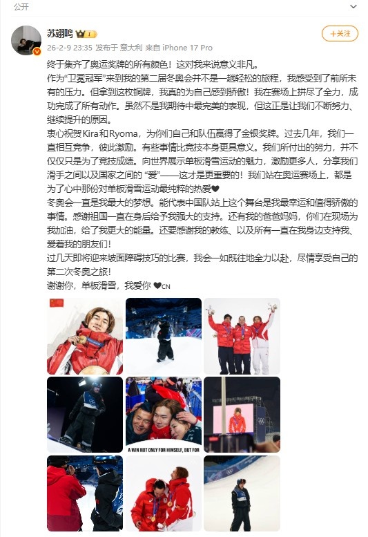 2月16日消息 在此前结束的米兰冬奥会单板滑雪男子大跳台决赛,苏翊鸣总分168.5分获得铜牌,为中国代表团夺得本届冬奥会首枚奖牌。今天,苏翊鸣更新了社媒。