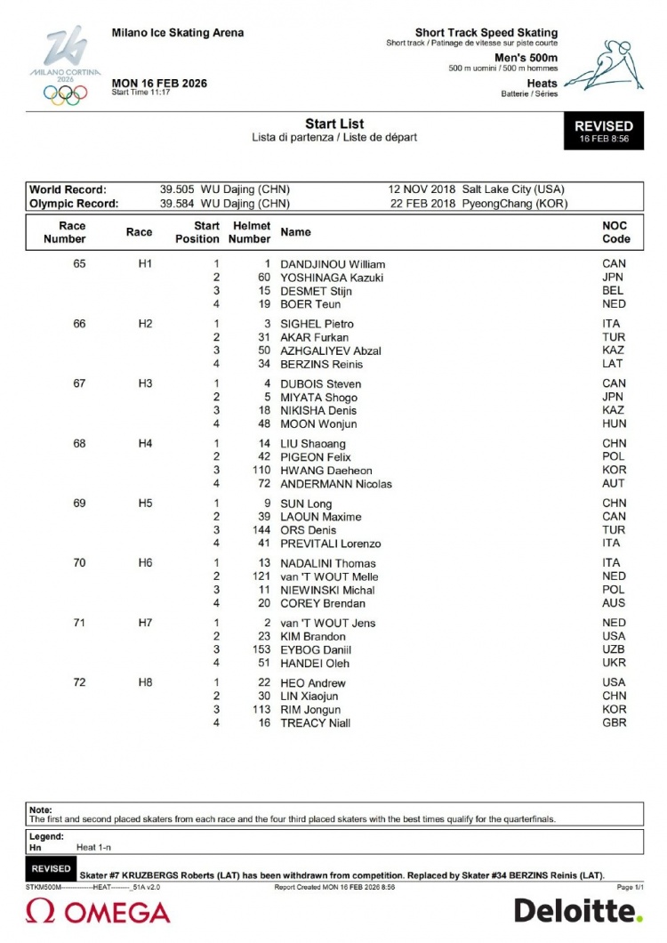 2月16日消息 官方消息,米兰冬奥会短道速滑男子500米预赛出发名单发生变更,韩国选手黄大宪被调整到中国选手刘少龙所在的第4组。