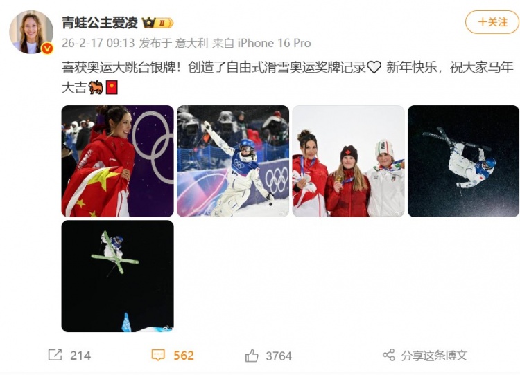 赛后,谷爱凌更新社媒,庆祝这枚来之不易的奖牌。谷爱凌写道:喜获奥运大跳台银牌!创造了自由式滑雪奥运奖牌记录,新年快乐,祝大家马年大吉。