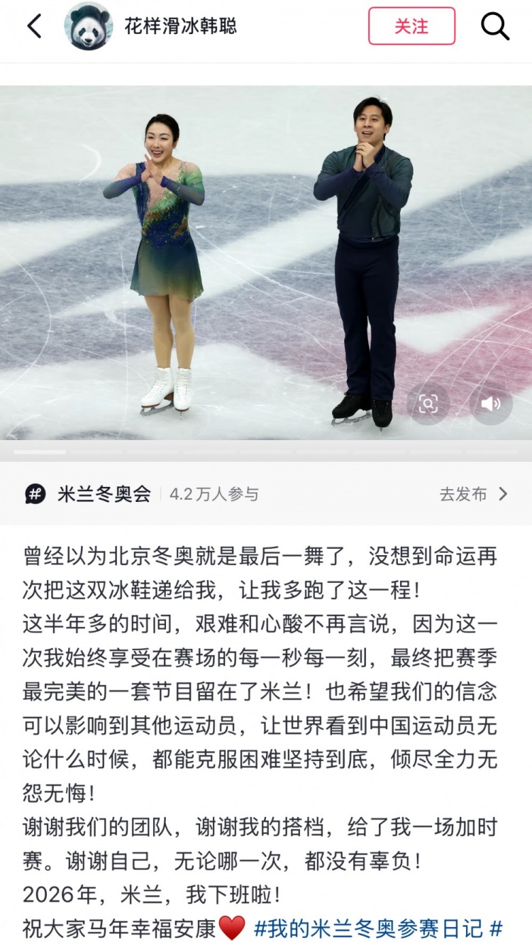 韩聪社媒:谢谢团队和搭档给了自己加时赛 把最完美节目留给米兰