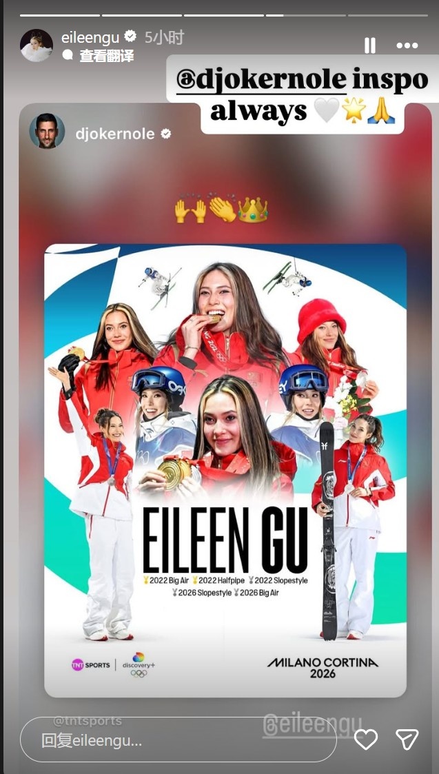 跨界互动!德约晒谷爱凌夺牌照表示祝贺,后者回复:永远的榜样