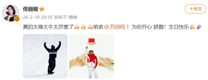 演员佟丽娅社媒发文祝贺苏翊鸣:“真的太棒太牛太厉害了👍👍👍弟弟@苏翊鸣!为你开心骄傲!生日快乐🎂🎉”