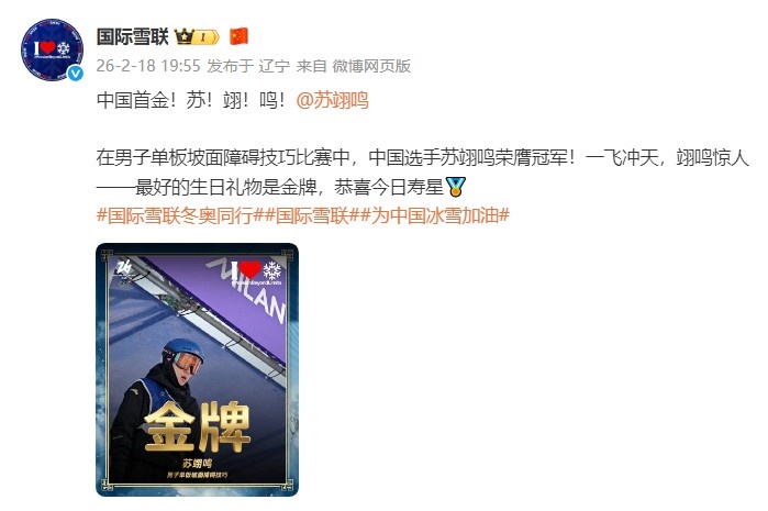 国际雪联祝贺苏翊鸣:最好的生日礼物是金牌,恭喜今日寿星🏅
