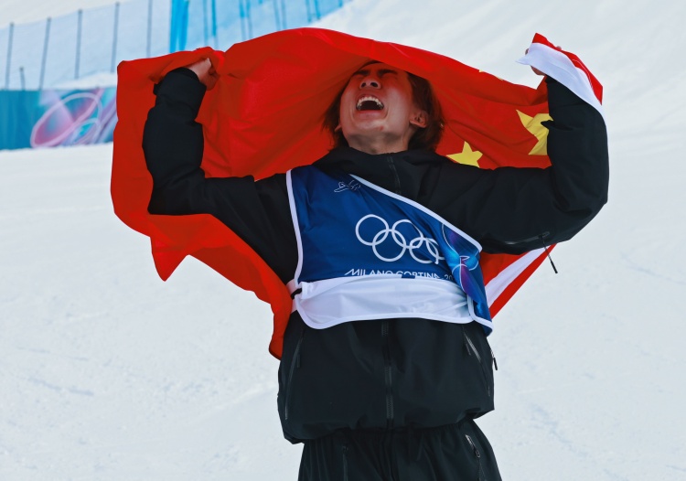 骄傲!苏翊鸣身披国旗激动庆祝,颁奖台上自信比“1”并再度落泪