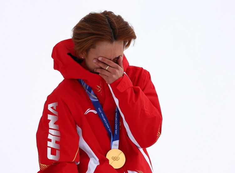 赛后苏翊鸣身披国旗激动庆祝,在颁奖典礼上,苏翊鸣自信比“1”同时再度落泪。