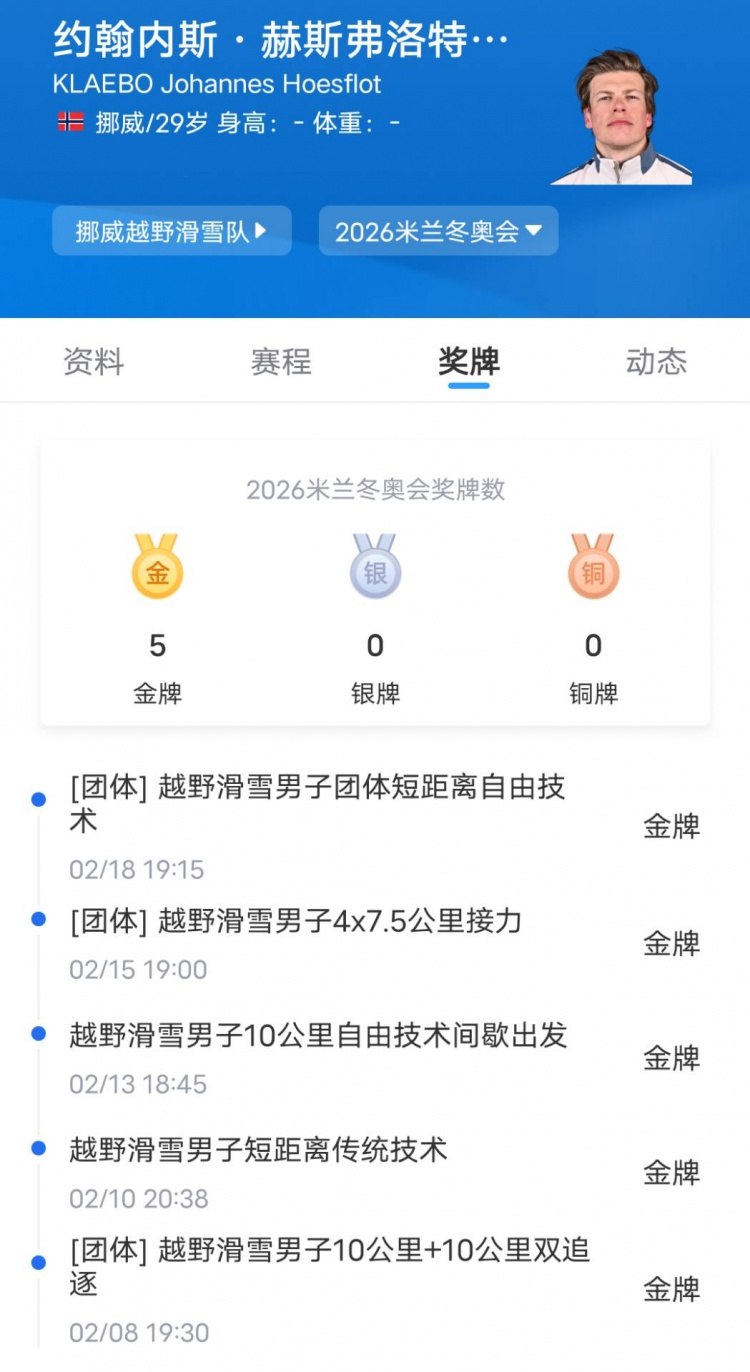 本届狂扫五枚金牌!29岁挪威选手克莱博斩获个人第十枚冬奥会金牌