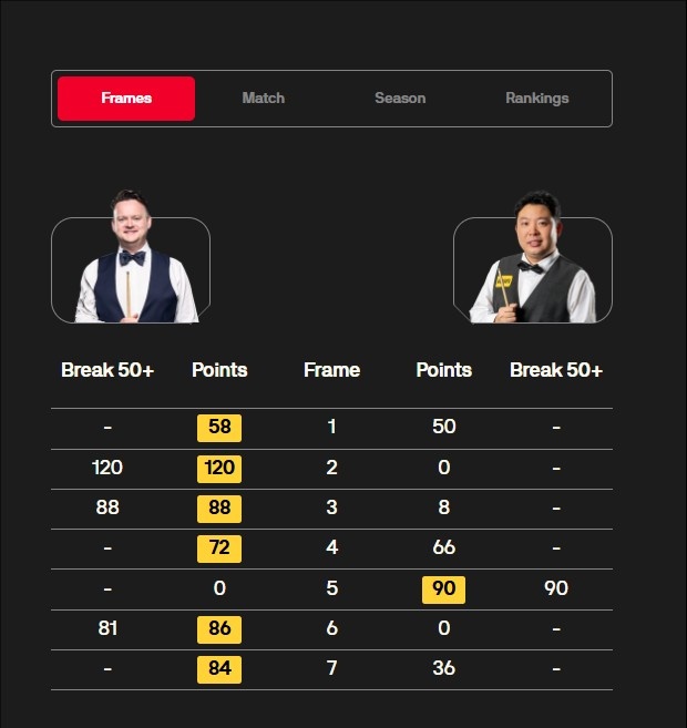 全场比赛,墨菲打出2杆50+和1杆破百,张安达打出单杆90分,最终1-6不敌墨菲,无缘8强。