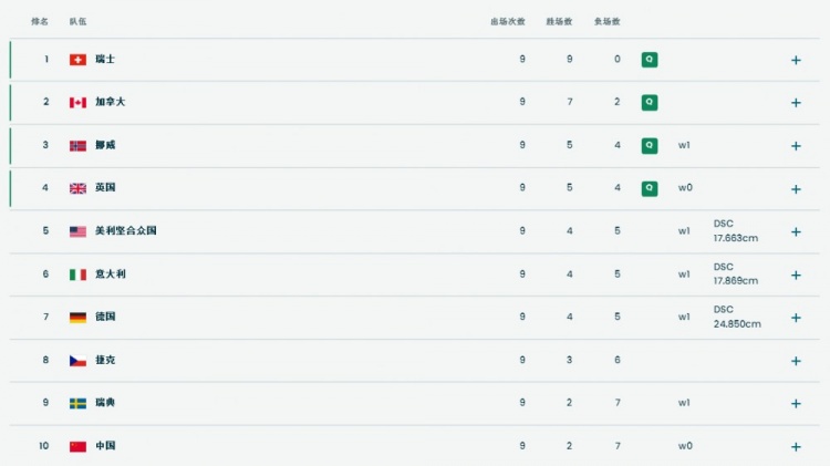 女子冰壶方面(封面图),中国队开局3场2胜(7-4英国、8-7意大利)情况下遭遇6连败,尤其是本场输给原先垫底的日本,最终以DSC劣势同样垫底。