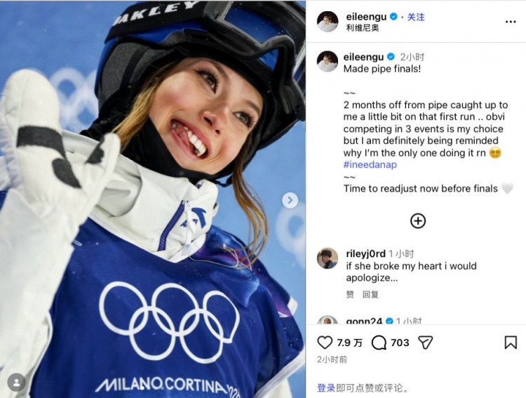 赛后谷爱凌更新了ins,晒出自己的比赛照并配文写道: