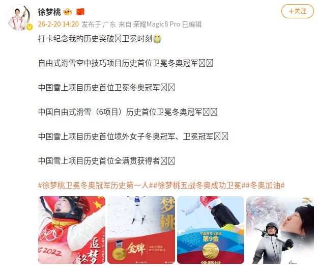 今日徐梦桃更新社媒,打卡纪念自己的历史突破。她在社媒晒出了多张海报,并配文写道:
