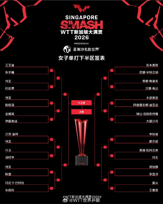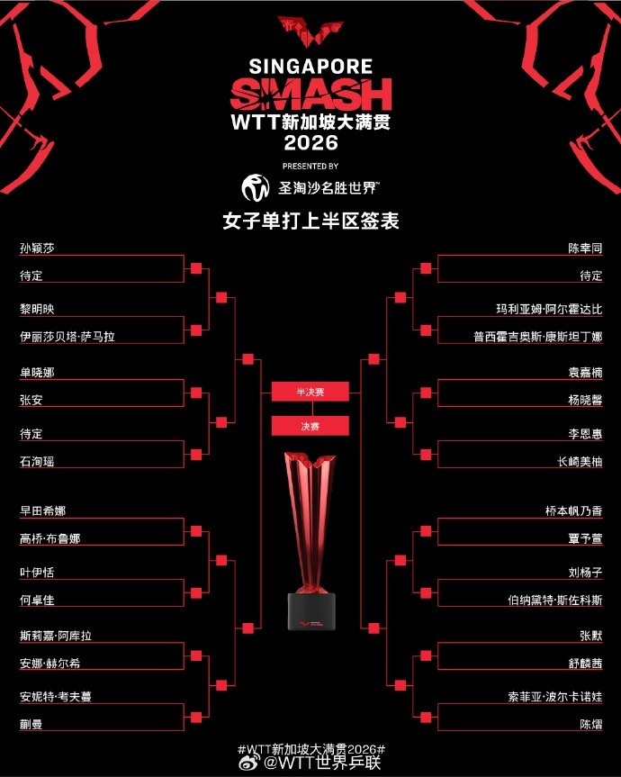 WTT新加坡大满贯女单签表:孙颖莎上半区、王曼昱和王艺迪下半区
