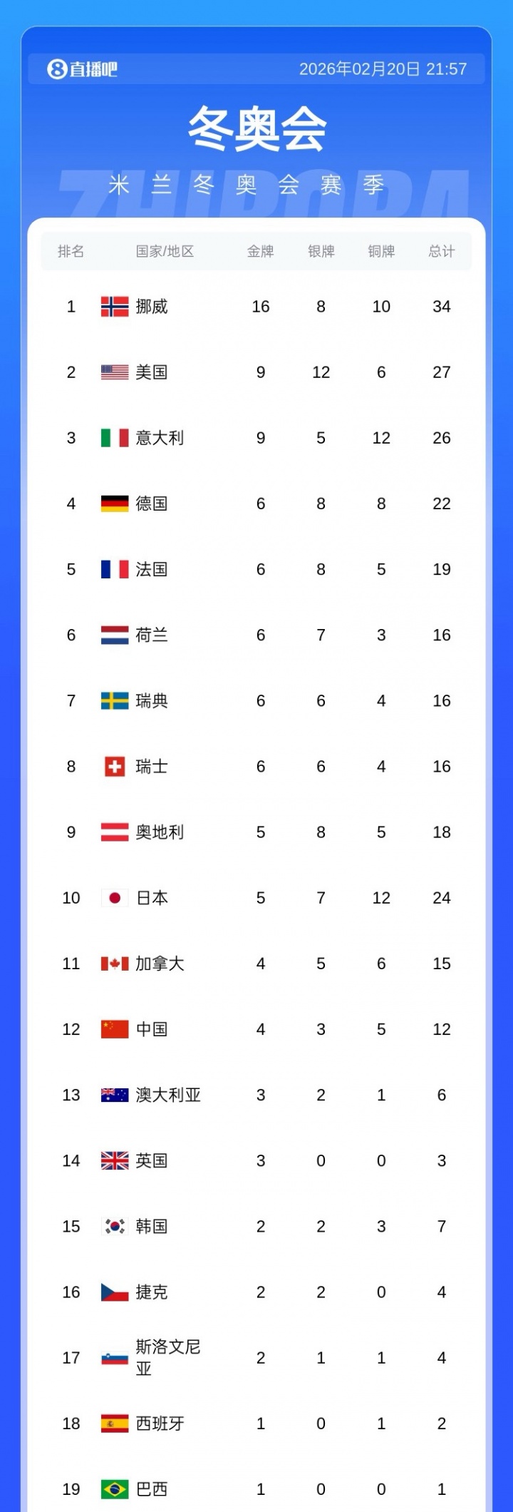 02月20日消息 自由式滑雪男子空中技巧决赛,王心迪夺金,李天马摘铜。中国队3天内连夺4金,位列奖牌榜第12位。