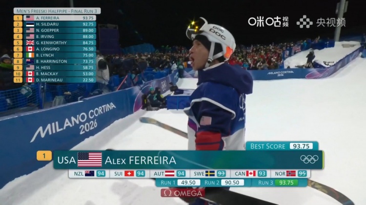 🏅 冠军:亚历克斯・费雷拉(美国),凭借第三滑93.75分的全场最高分绝杀登顶,斩获个人生涯首枚冬奥金牌