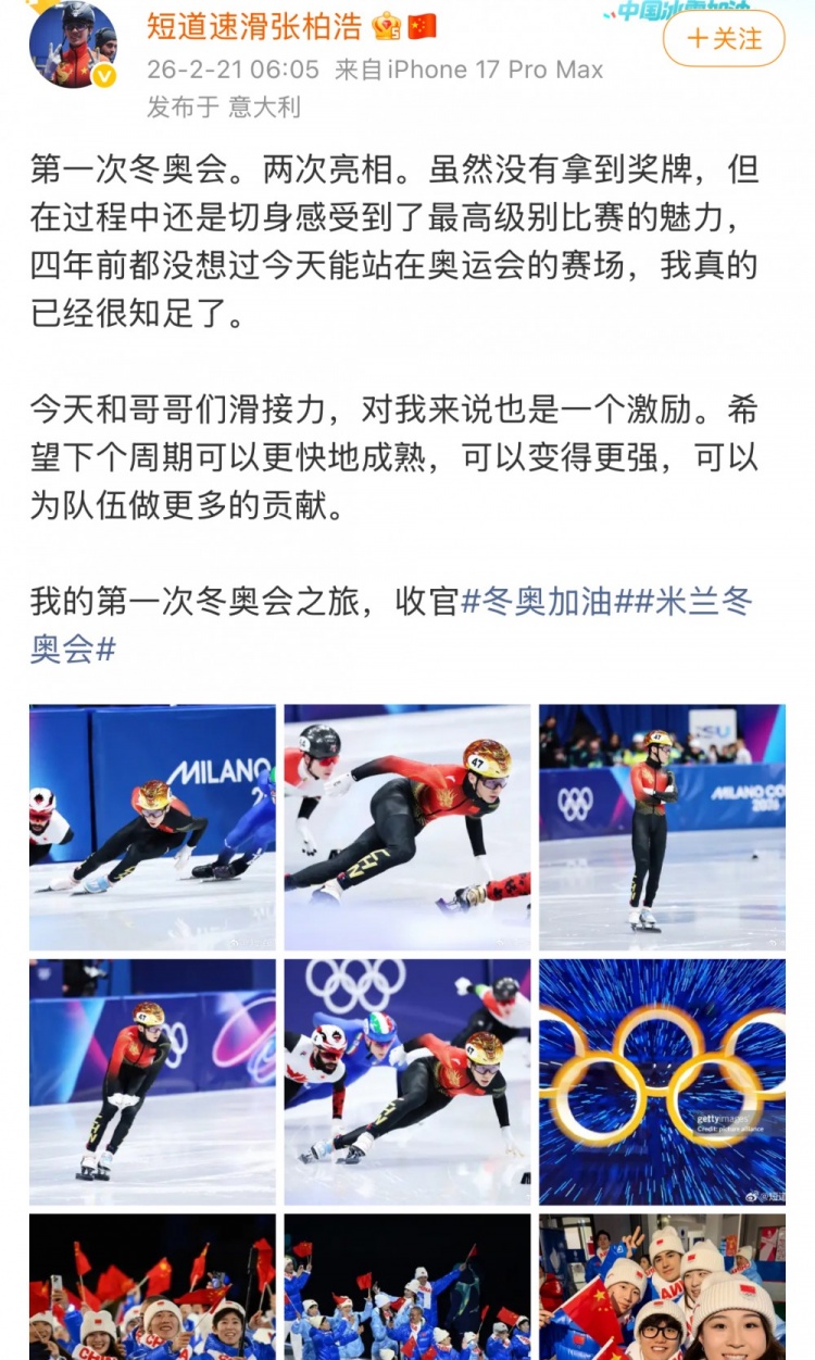 张柏浩社媒:第一次冬奥之旅收官 下个周期要变得更强做更多贡献