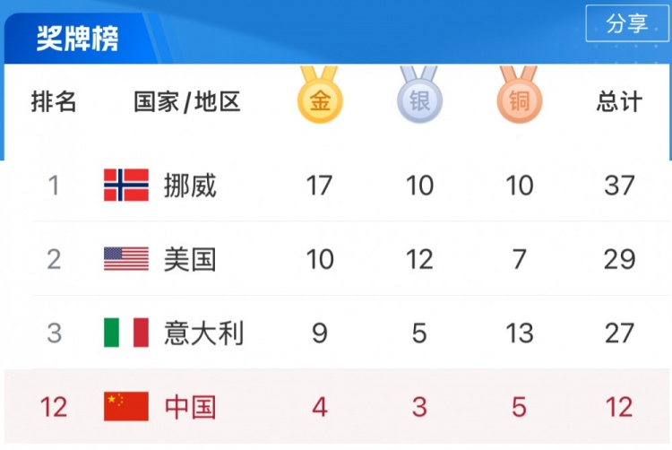 2月21日消息 米兰冬奥会昨日结束了第14个比赛日,挪威代表队在昨日夺得1金2银,以17枚金牌领跑奖牌榜。